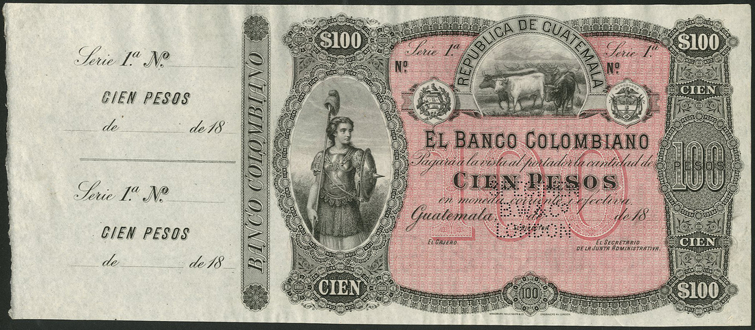 (†) El Banco Colombiano, Guatemala, specimen 100 Pesos with counterfoil, 18- (1887), black on pink underprint, soldier with spear at left, vignette of cattle at top centre, arms of Guatemala at upper left, arms of Colombia at upper right, value in each corner, reverse red, value in guilloches at centre and in each corner