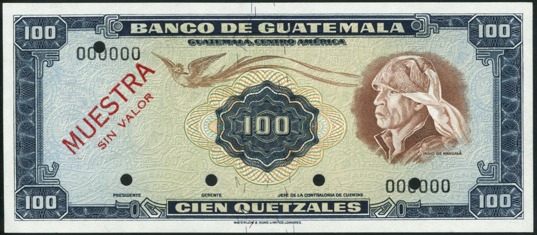 Banco De Guatemala, a group of specimens comprising 10, 20 and 100 quetzales form the 1955 issue, 100 quetzales, ND (1959), 10 quetzales, 1964, 50 quetzales, 1967, all have no serial numbers or signatures and with SPECIMEN overprint