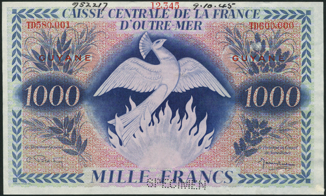 (†) Caisse Centrale de la France d'Outre-Mer, printers archival specimen 1000 francs, 2 February 1944, serial number range TD580001 - TD600000, blue on multicolour underprint, phoenix rising from the flames at centre, value at left and right, red GUYANE overprint at upper left and right, perforated SPECIMEN