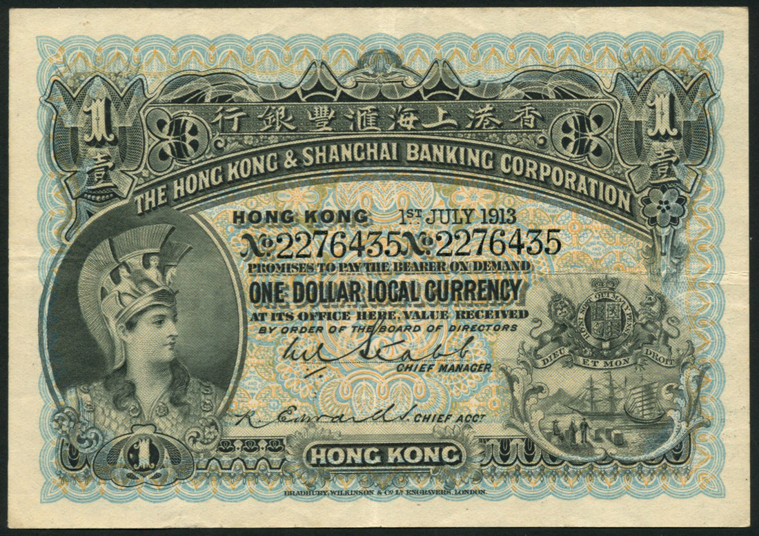 Hong Kong & Shanghai Banking Corporation, $1, 1 July 1913, serial number 2276435, black on orange and blue underprint, Athena at left, arms at low right, value at top left and right and low left, reverse red, allegorical maiden with lyre at centre, also a 1935 $1, blue