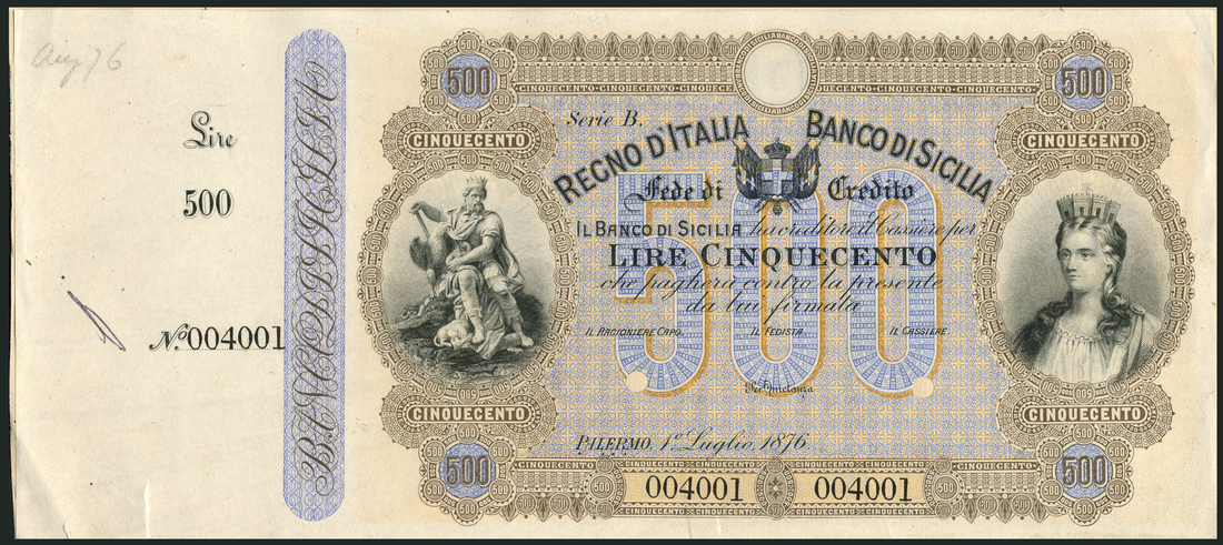 (†) Regno d'Italia/Banco di Sicilia, specimen 500 lire, Palermo, 1 July 1876, serial number 004001, pale brown, blue and orange, turreted female (Italia) at right, Victor Emmanuel II at left, value and triskeles at centre, value at each corner, counterfoil at left, reverse blue and orange, brown, value