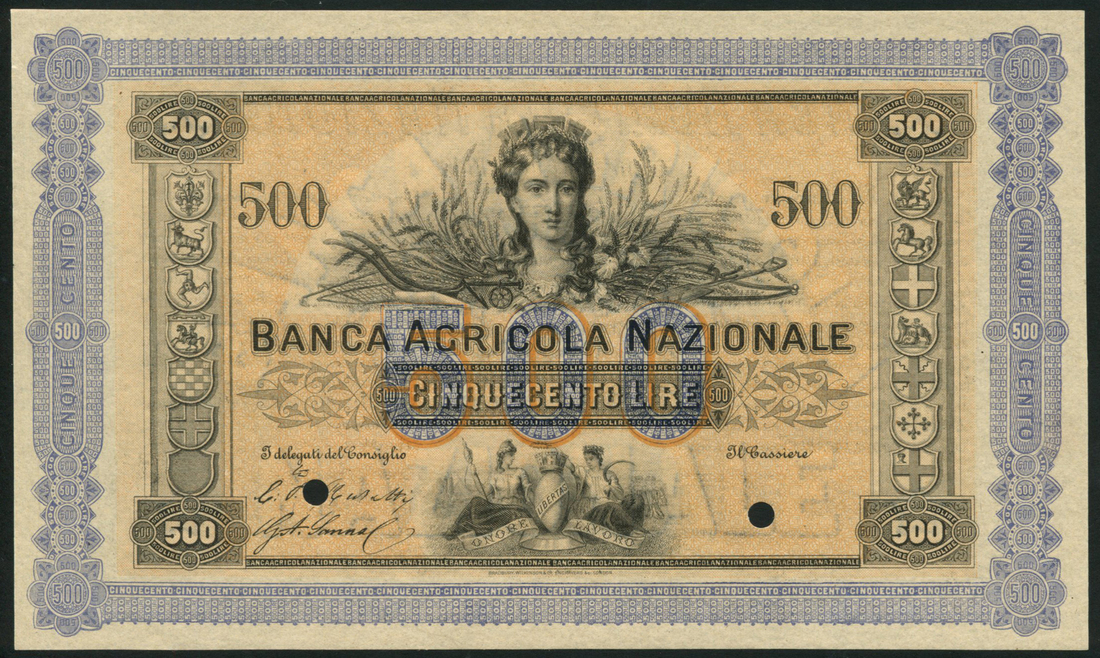 (†) Banca Agricola Nazionale, Italy, specimen 500 lire, ND (1870), blue and black on orange underprint, Italia at upper centre, arms at low centre, 14 coats of arms at left and right, value at centre and each corner, two cancellation holes
