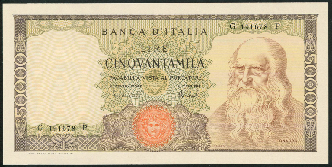 Banca d'Italia, 50000 lire, 4 February 1974, serial number G 191678 P, brown on olive green underprint, portrait Leonardo da Vinci at right, value in border at left and right, red seal low centre, reverse, city view at centre