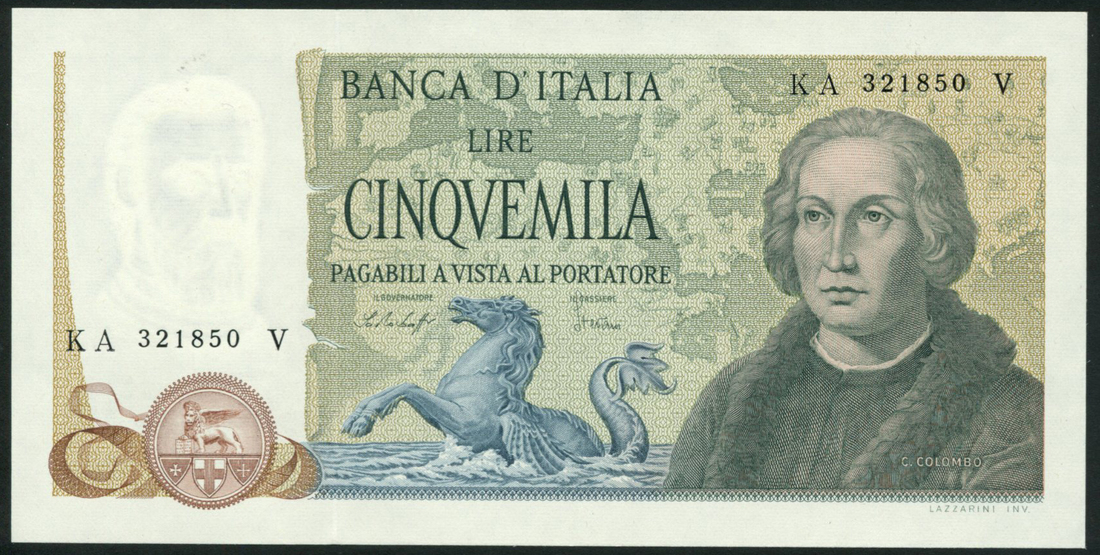 Banca d'Italia, 5000 lire, 10 November 1977, serial number KA 321850 V, brown, green, and blue, Columbus at right, hippocamp at centre, arms at low left, Baffi and Stevani signatures