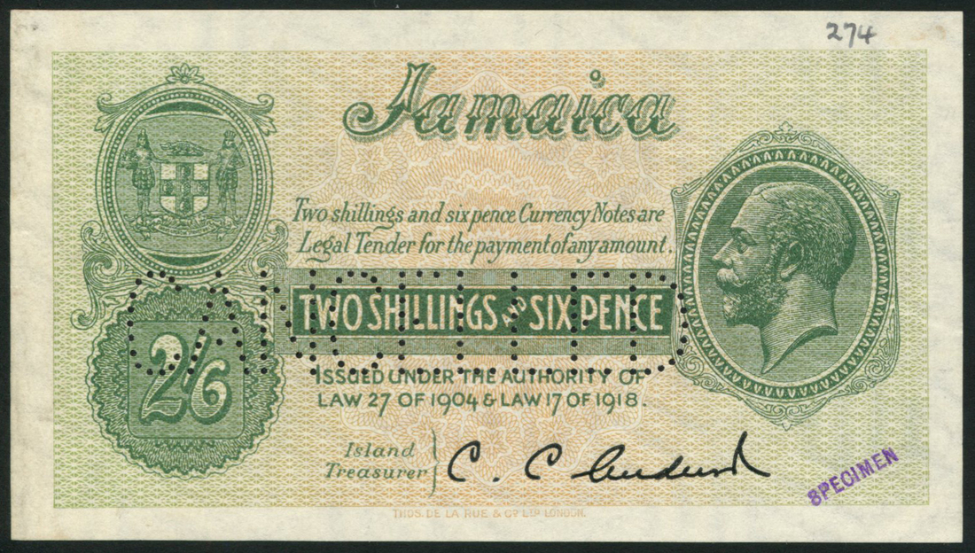 (†) Government of Jamaica, specimen 2 shillings and 6 pence, 1918, no serial number, green on red and orange underprint, George V at right, arms at top left, value in tablet at centre and at low left, reverse orange, helmeted head of Athena at centre, perforated CANCELLED, and small purple SPECIMEN stamp