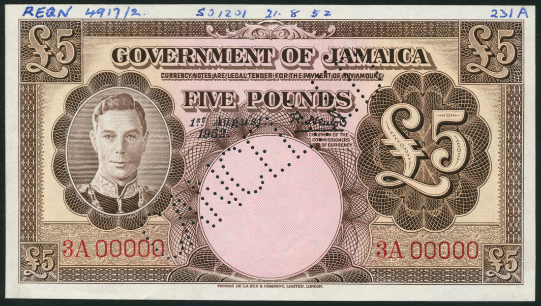 (†) Government of Jamaica, specimen £5, 1 August 1952, red serial number 3A 00000, dark and light brown and pink, George VI at left, value at right, signature of Robert Newton, reverse pink and brown, value at left and right, arms top centre