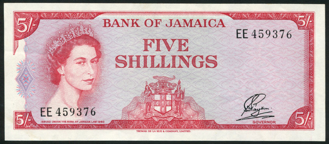 Bank of Jamaica, 5 shillings, ND (1961), serial number EE 459376, red on violet underprint, portrait Queen Elizabeth II at left, coat of arms low centre, reverse, Dunn's River Falls, also, States of Jersey, ND (1963), serial number B305276, light brown on multicolour underprint, portrait Queen Elizabeth II at right, reverse, St Ouen's Manor