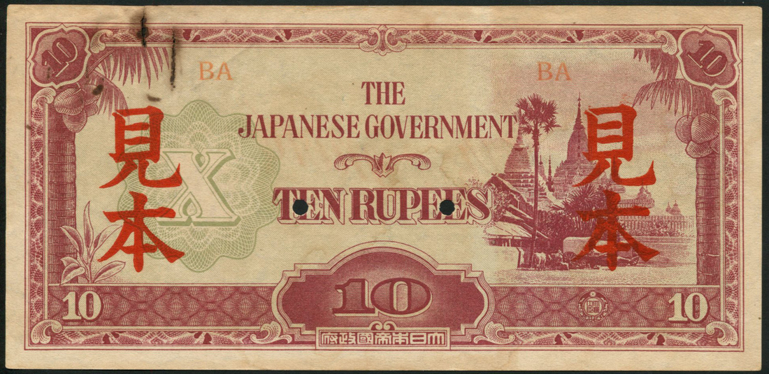 Japanese Government, specimen set from the 1942 issue, 1/4 rupee, blue, 1/2 rupee, olive, 1 rupee, green, 5 rupees, blue and 10 rupees, red, most with Ananda Temple at right, all with red overprint and perforated