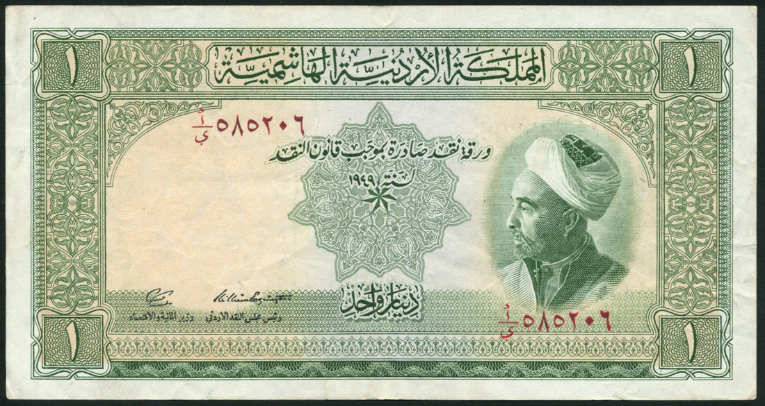 (x) Hashemite Kingdom of Jordan, 1 dinar, L.1949, prefix A/J, and 500 fils, L.1949 (1952), prefix B/C, green and purple respectively, first with King Abdullah at right, second with irrigation ditches at centre