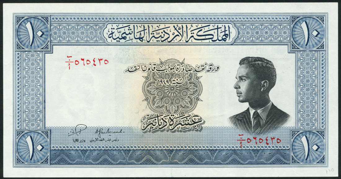 (x) Hashemite Kingdom of Jordan, 10 dinars, law of 1949 (1952), serial number B/A 565435, blue and black, King Hussein at right, signatures of Hananeyah and Toukan, reverse blue and white, Treasury of Pharaoh at Petra