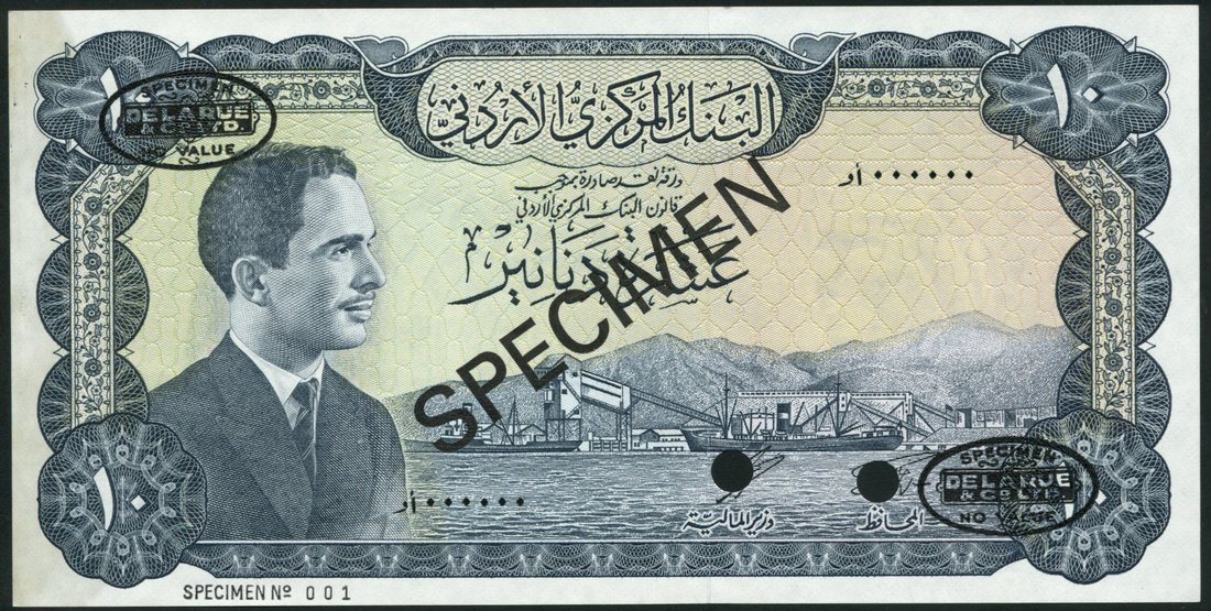 (x) Central Bank of Jordan, specimen 10 dinars, law of 1959, second issue, serial number 000000, dark blue-grey and multicoloured, King Hussein at left, signature 23, reverse blue-grey, Baptismal Site-River Jordan