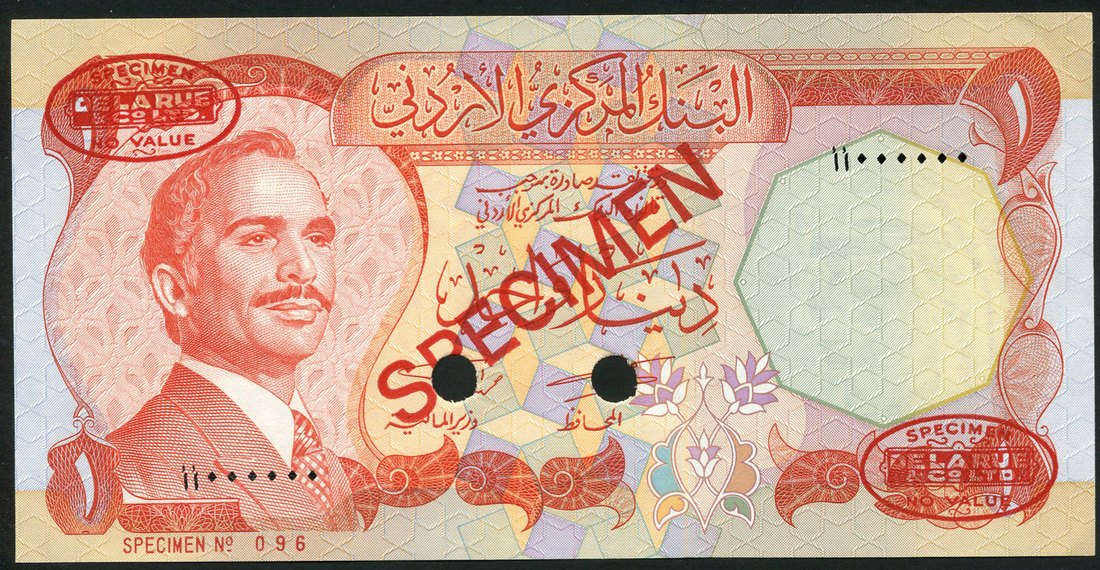 (†) Central Bank of Jordan, specimen 1 dinar, ND (1973-), green and multicoloured, King Hussein at left, reverse green, the Dome on the Rock in Jerusalem, signatures of Massaideh and Al Nabulsi, Al Dabbas and Al Nabulsi, specimen 1 dinar, ND (1977-), red-orange, signatures of Al Dabbas and Al Nabulsi, King Hussein at left