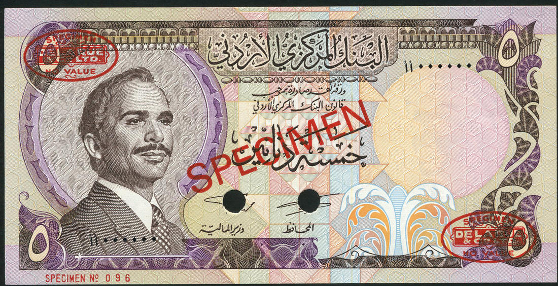 (†) Central Bank of Jordan, specimen 5 dinars, ND (1973-), pink-red and multicoloured, King Hussein at left, reverse green, the Monastery at Petra, signatures of Massaideh and Al Nabulsi, also specimen/colour trial 5 dinars, ND (1977-), lilac and multicoloured,