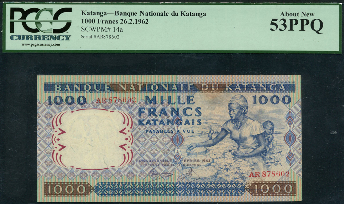 (x) Banque Nationale du Katanga, 100 francs, 1962, serial number DA 071880, green on multicolour, 1000 francs, 1962, serial number AR878602, blue on multicolour