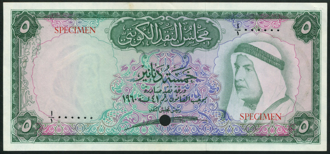 (†) Kuwait Currency Board, a colour trial 5 dinars, ND (ca 1960), zero serial numbers, green and multicoloured, Amir Shaikh Abdullah al-Salem Al-Sabah at right, value at each corner, Al-Sabah signature, reverse green, low income housing