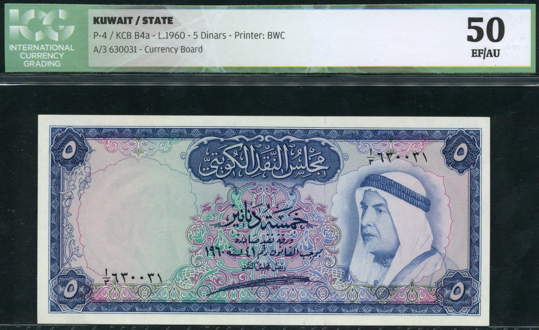 Kuwait Currency Board, 5 dinars, L.1960 (1961), serial number A/3 630031, blue on multicolour, Amir Sheikh Abdullah al-Salem al-Sabah signature and portrait at right, reverse blue, street view