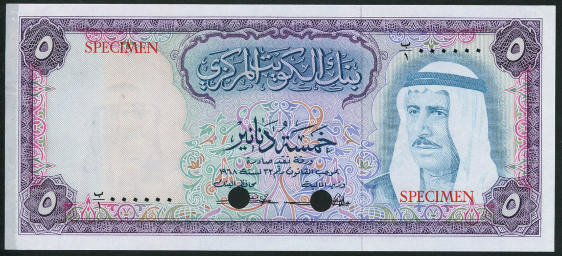 (†) Central Bank of Kuwait, colour trial 5 dinars, law of 1968, zero serial numbers, purple and multicoloured, Amir Shaikh Sabah Al-Salem Al-Sabah at right, Al-Sabah signature, reverse purple, aerial view of Kuwait left centre