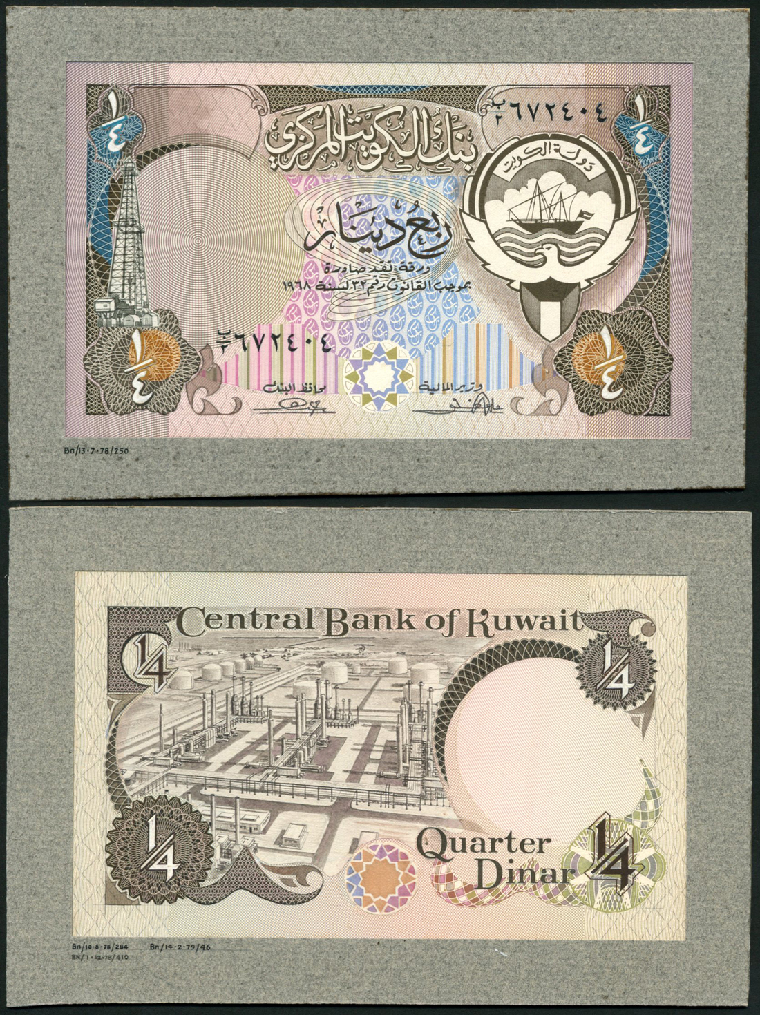 (†) Central Bank of Kuwait, obverse and reverse composite essays on board for 1/4 dinar, 1968 (1980), serial number 672404, brown and turquoise on multicolour underprint, arms with dhow at right, oil derrick at left, value at each corner, reverse brown, oil fields at left centre, value at each corner