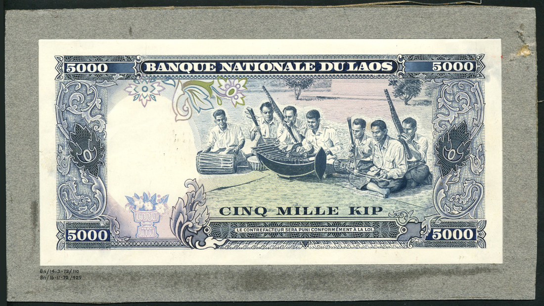 (†) Banque Nationale du Laos, a reverse composite essay on card for 5000 Francs, ND (1972), deep blue on pale green and pink underprint, vignette of seven musicians at centre, ornately decorated borders at left and right, value in each corner