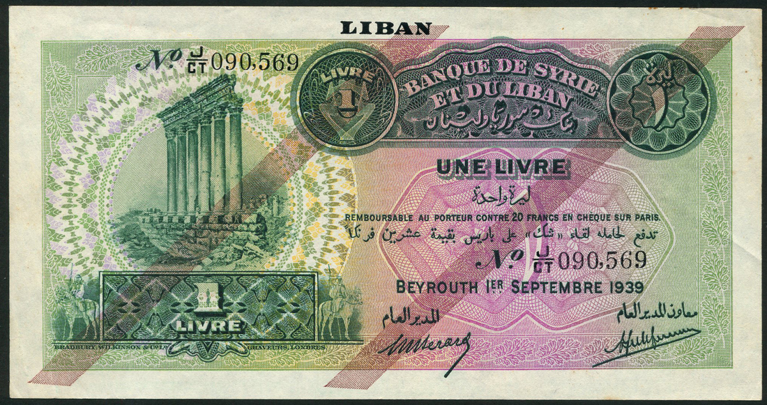 (x) Banque de Syrie et du Liban, Lebanon, 1 livre, 1st September 1939, prefix J/CT, green, lilac and yellow-orange, the pillars of Baalbek at left, two diagonal red lines across face, LIBAN top centre, Berard & Laferriere signatures, reverse red & green, Beirut and coastal view at centre, two diagonal purples lines across face