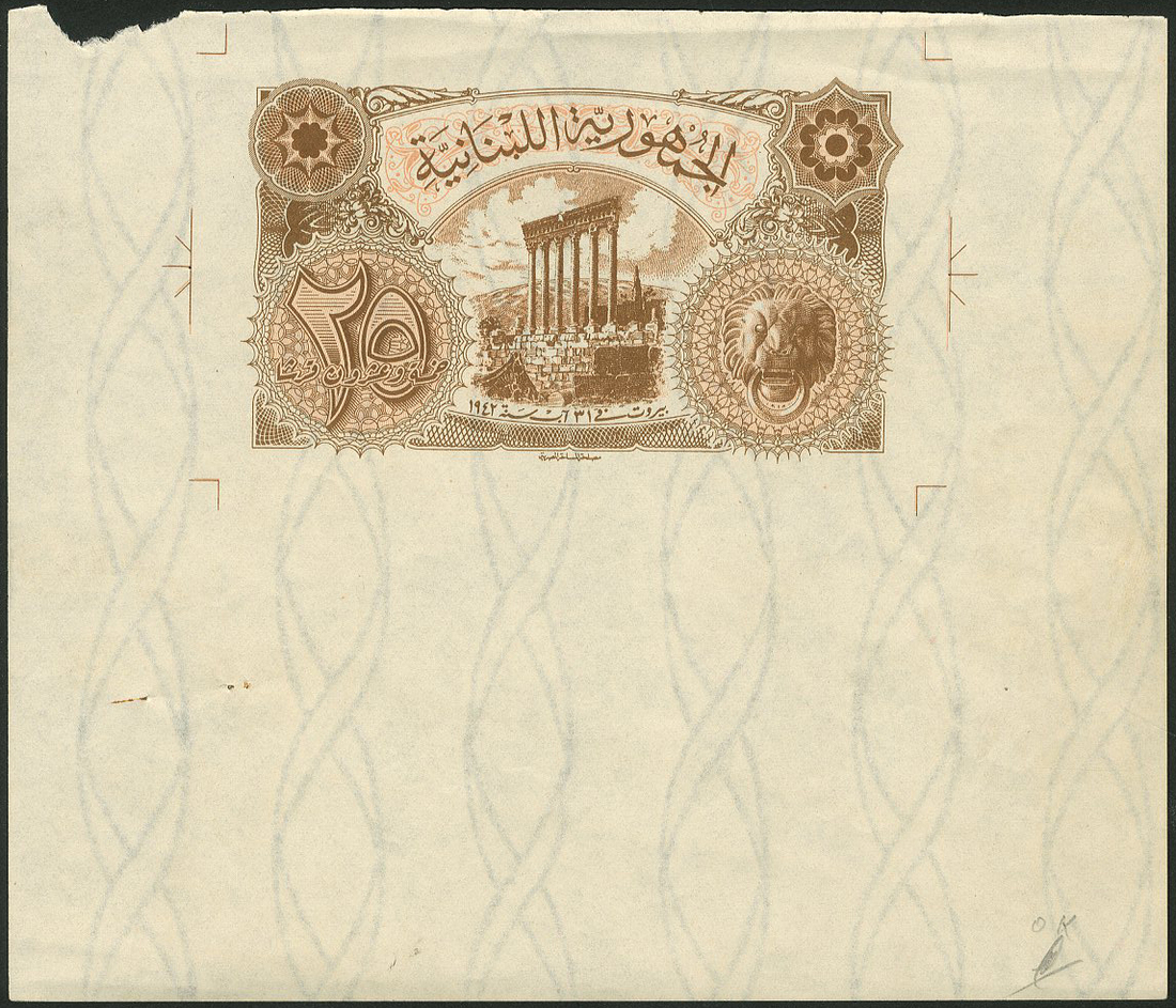 (x) Republique Libanaise, large format proof obverse and reverse 25 piastres, 1942, blue on pale lilac, bank title at centre, value top left and right and at centre, ornate border, reverse, brown and pink, pillars of Baalbek at centre, helix watermarked paper