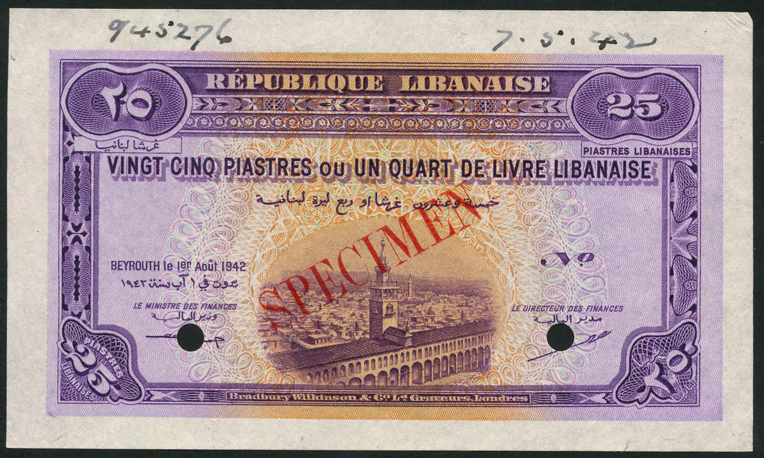 (†) Republique Libanaise, specimen proof 25 piastres, 1 August 1942, lilac on orange, tan and purple underprint, Omayyad Mosque at centre, value at each corner, red SPECIMEN overprint, two cancellation holes