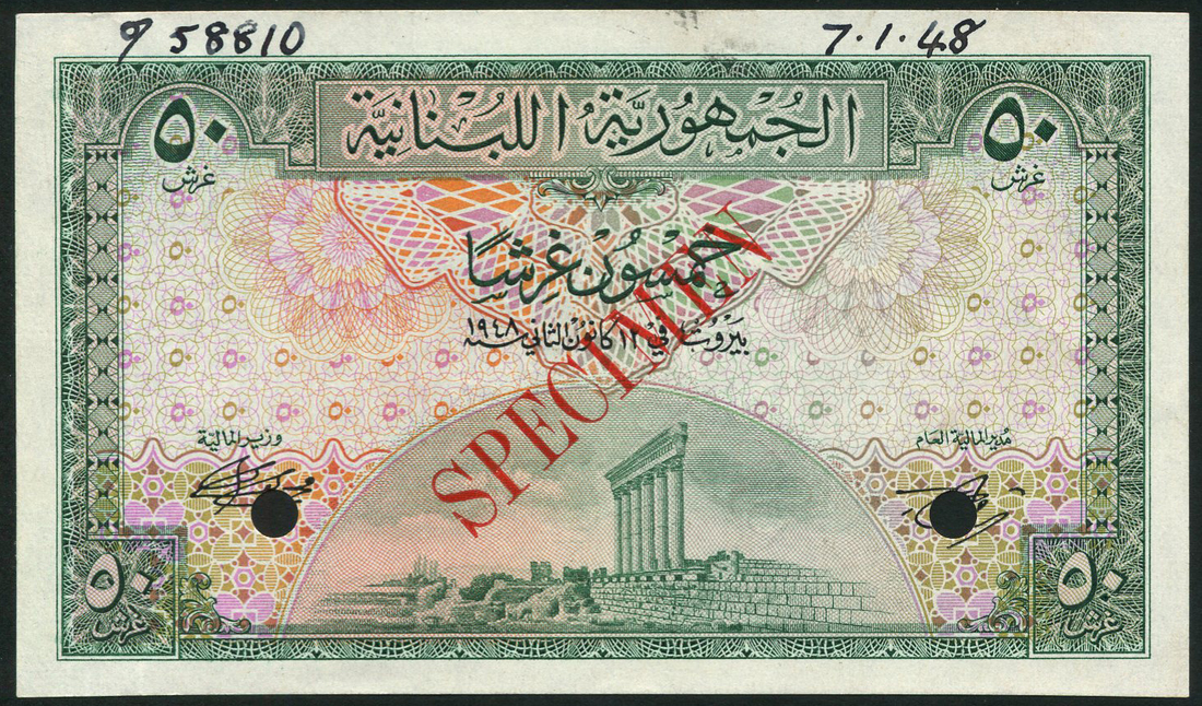 (†) Republique Libanaise, specimen 5 and 10 piastres, 1950 and 50 piastres, 1948, brown, blue and green respectively, values on face, last with Pillars of Baalbek at low centre, perforated or overprinted SPECIMEN, last with two cancellation holes