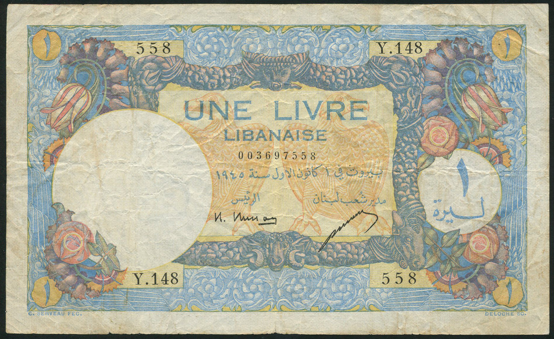 (x) Banque de Syrie et du Liban, Lebanon, 1 livre, 1945, serial number Y.148558 blue and multicoloured, two eagles at centre, ornate scroll work around, value at each corner, reverse multicoloured, cedar trees and Mount Lebanon in field, ears of corn and antelope heads at left and right,