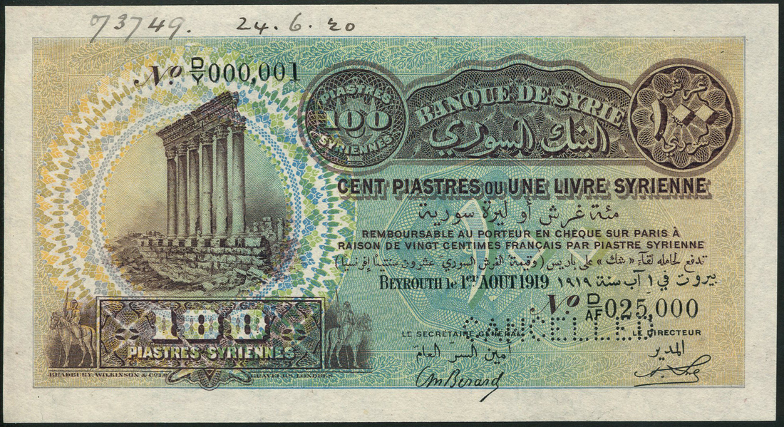 (†) Banque de Syrie, partial specimen set from the first issue, 1919, comprising 5 piastres, green, 25 piastres, blue, 50 piastres, purple and 100 piastres, brown, all with multicolour underprint, last three perforated SPECIMEN or CANCELLED, second without serial numbers