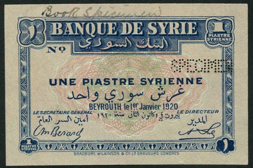 (†) Banque de Syrie, specimen 1 piastre, 1 January 1920, no serial number, blue on pink and green underprint, value at each corner, reverse brown, pillars of Baalbek, perforated SPECIMEN