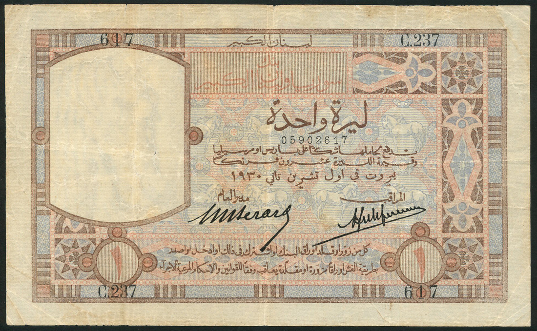 (x) Banque de Syrie et du Grand-Liban, Lebanon, 1 livre, 1930, serial number C.237 617, muted blues and browns, ornate border, Berard and Laferriere signatures, reverse, river and mountains in background, GRAND-LIBAN on reverse
