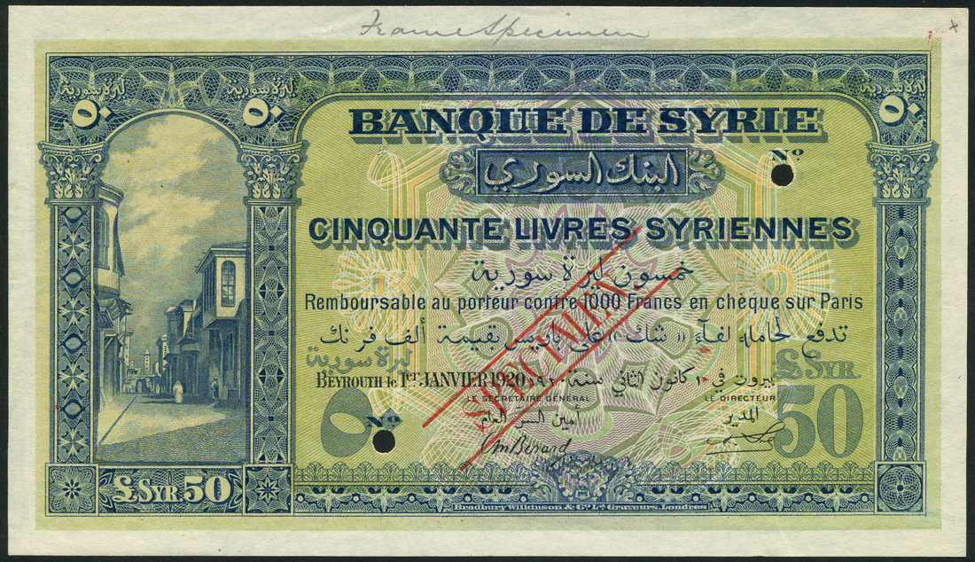 (†) Banque de Syrie, Syria, specimen 50 Livres, 1 January 1920, no serial numbers, blue on olive-green and multicoloured underprint, street scene in Beirut at left, reverse purple, salmon pink, pale green and lilac, feluccas and coastline in rectangular frame at centre, value at left and right, overprinted SPECIMEN in red on obverse, wo punch holes