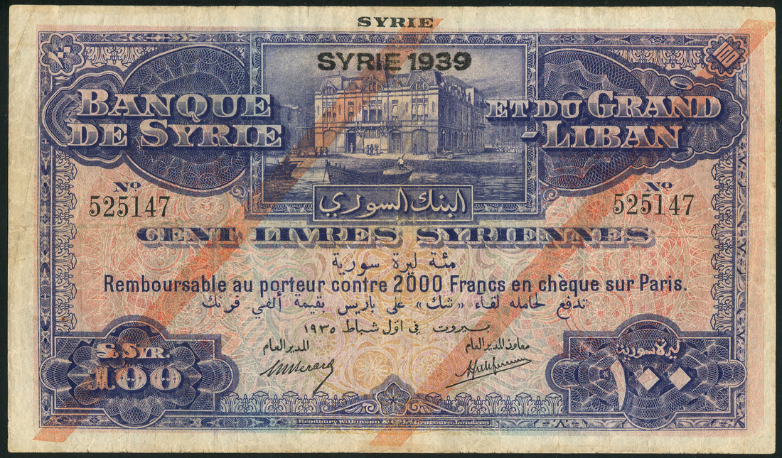 (x) Banque de Syrie et du Grand-Liban, Syria, 100 livres, 1935, serial number 525147, blue and pale pink and orange, Central Bank building on quay side at top centre, value at centre and low left and right, two pale red diagonal lines across face, SYRIE 1939 overstamp top centre, Berard and Laferriere signatures, reverse brown, pale blue and orange and pink, view of Antioch in circular frame at centre, value at left and right