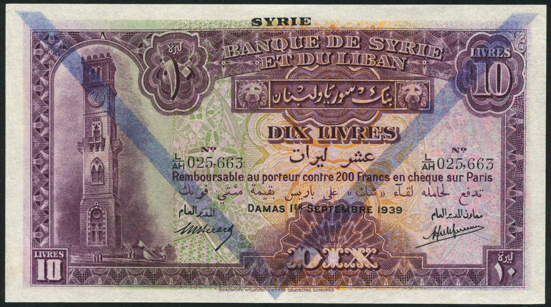 (x) Banque de Syrie et du Liban, Syria, 10 livres, Damas, 1 September 1939, serial number L/AH 025663, violet and multicoloured, the clock tower in Aleppo at left, red diagonal overprint, Berard and Laferriere signatures, SYRIE in black overprint top centre, blue chevron overprint, Berard and Laferriere signatures, reverse violet and multicoloured, the ancient port of Lattakieh in oval frame at centre, value at left and right