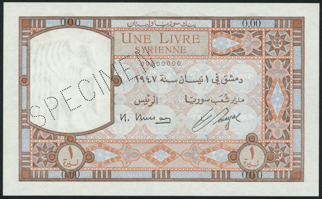 (x) Banque de Syrie et du Liban, Syria, specimen 1 livre, 1947, zero serial number, pale pink brown and pale blue, value in pink brown low right, ornate scroll work around, Busson and Souayal signatures low left, reverse, pink brown and multicoloured, Jounieh's Bau near Beirut left centre flanked by ornate columns, ornate scroll work around