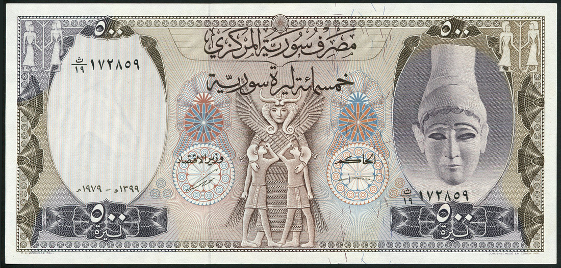 (x) Central Bank of Syria, 500 pounds (6), 1976, 1979, 1982, 1986, 1990, 1992, olive green and multicolour, motifs from ruins of Kingdom of Ugarit, head at right, value in ornate tablets top left and right and low left and right, reverse, olive green and brown, ancient religious wheel and cuneiform clay tablet, bank title in English at top