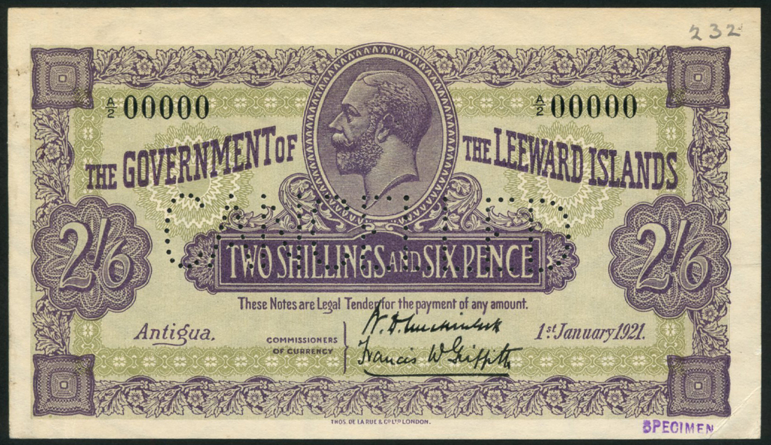 (†) Government of the Leeward Islands, specimen 2 shillings and 6 pence, Antigua, 1 January 1921, serial number A/2 00000, purple on olive green underprint, George V at top centre, value in tablet at centre, and at left and right, reverse blue, arms at centre, flanked by values, perforated CANCELLED and small purple SPECIMEN stamp