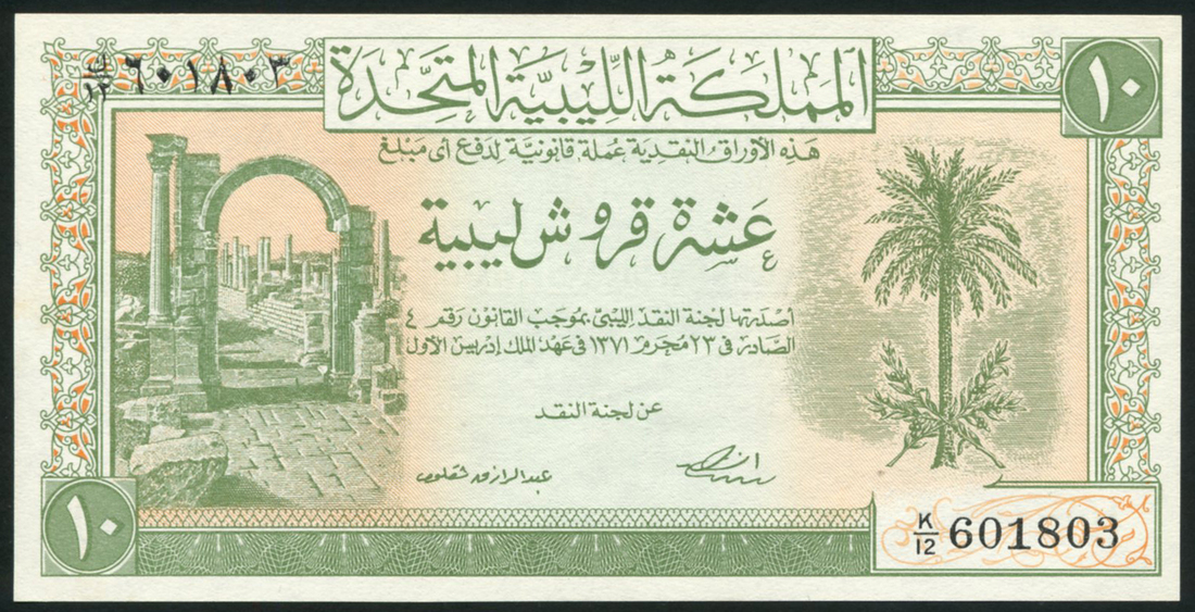United Kingdom of Libya, 5 piastres (2), ND (L.1951), serial numbers L/10 811442, L/10 811445, red on pale yellow underprint, 10 piastres, ND (L.1951), serial number K/12601803, light green on pale orange underprint