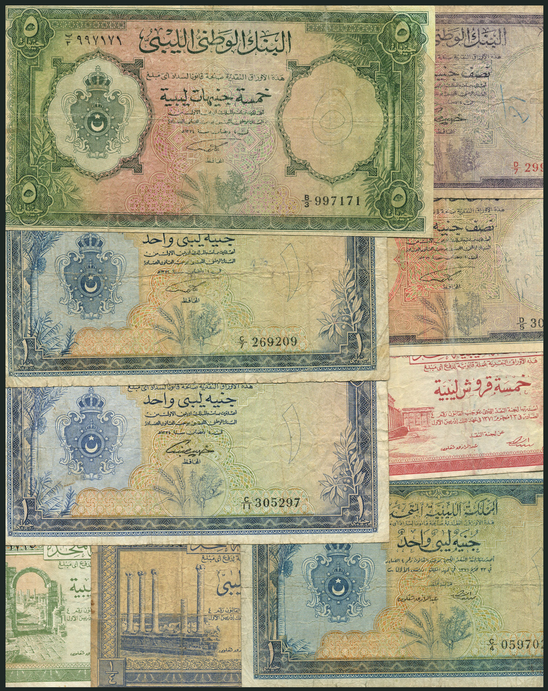 United Kingdom of Libya, a group of comprising 5 and 10 piastres, £1/4, £1, all from the 1951 issue, with Mahmoud Bay Munataser, National Bank of Libya, £1/2 (2), black prefix D/5 and red prefix D/7, £1 (2), prefix C/7, C//11, £5, 1955, prefix B/3