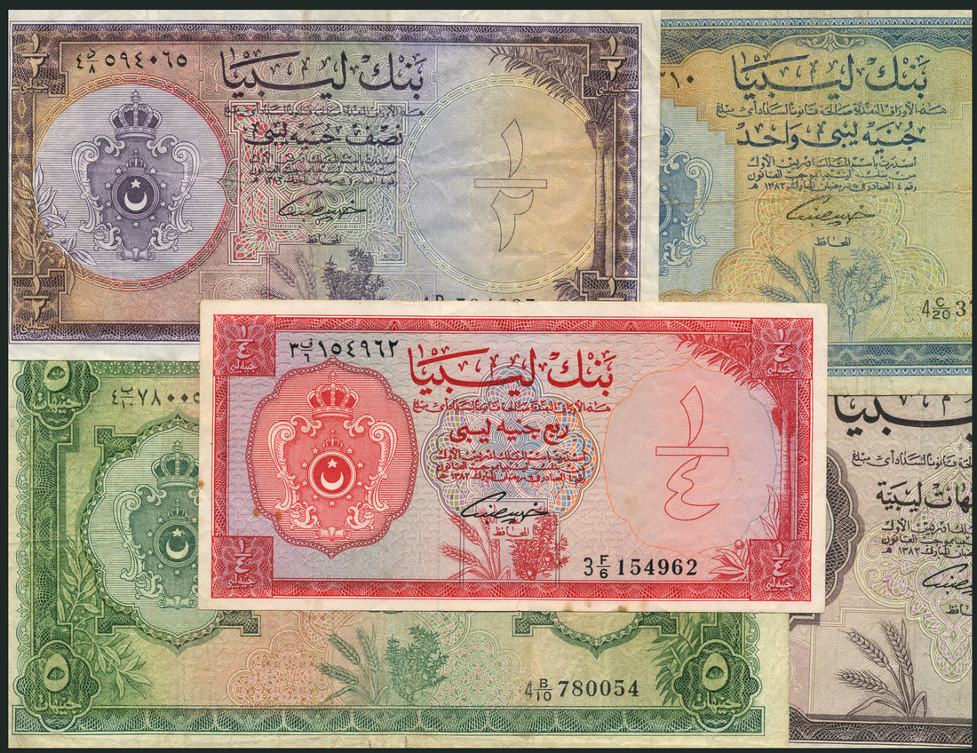 Bank of Libya, a full set from the 1963 first issue, £1/4, £1/2, £1, £5, £10, all with coat of arms at left, what and jolbann plant low centre, Khalil Al Bennani signature
