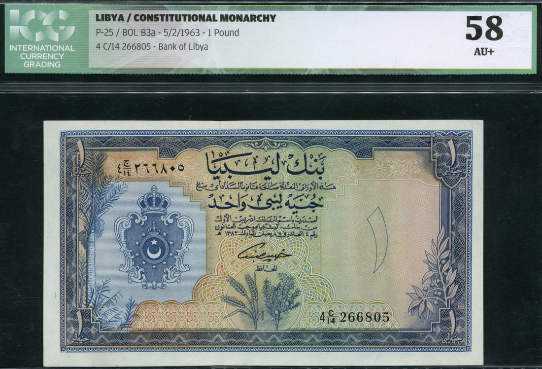 (x) Bank of Libya, 1 pound (2), 1963, serial numbers 4 C/14 266804-805, blue on multicolour underprint, arms at left, value at right and each corner