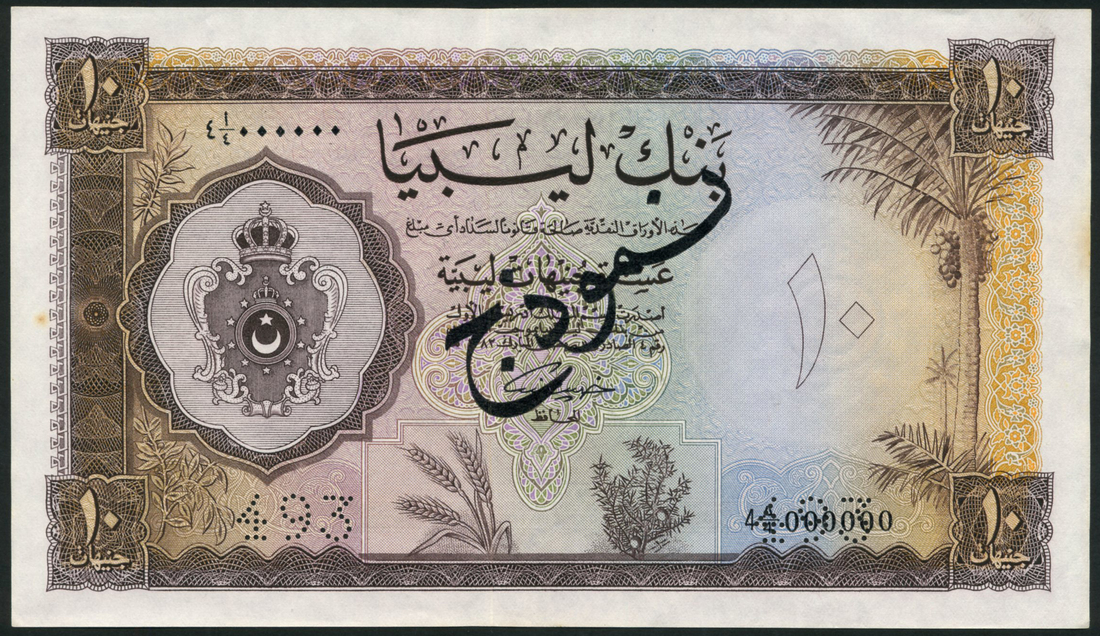 Bank of Libya, specimen £10, 1963 first issue, serial number 4 A/4 000000, brown on multicolour, coat of arms at left, palm tree and value in field at right, black specimen overprint, perforated