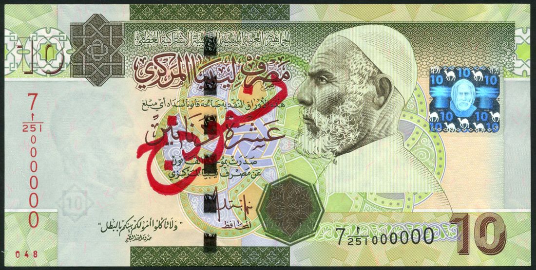 Central Bank of Libya, specimen 10 dinars, 2007, serial number 7 1/251 000000, green, Omar El Mukhtar and hologram at right, reverse hilltop fortress in Sabha, red specimen overprint