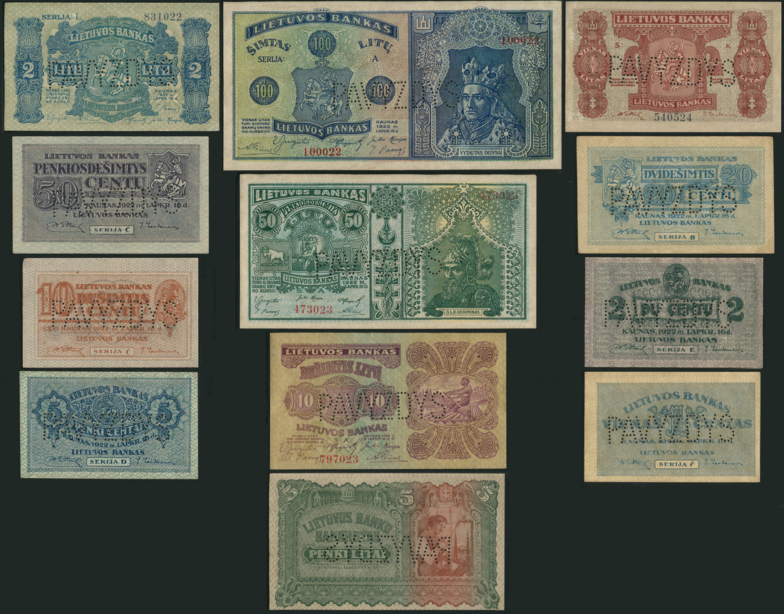 Bank of Lithuania, a partial specimen set of the November 1922 issue, comprising, two each of 1 centas, 2 centu, 5 centai, 10 centu, 20 centu, 50 centu, 1 litas, 2 litu, 5 litai, 10 litu, 50 litu, 100 litu