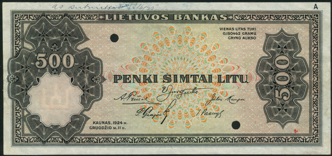 (†) Bank of Lithuania, specimen 500 litu, 1924, no serial number, brown on multicolour underprint, value at left and right, reverse blue, arms at top centre, two cancellation holes
