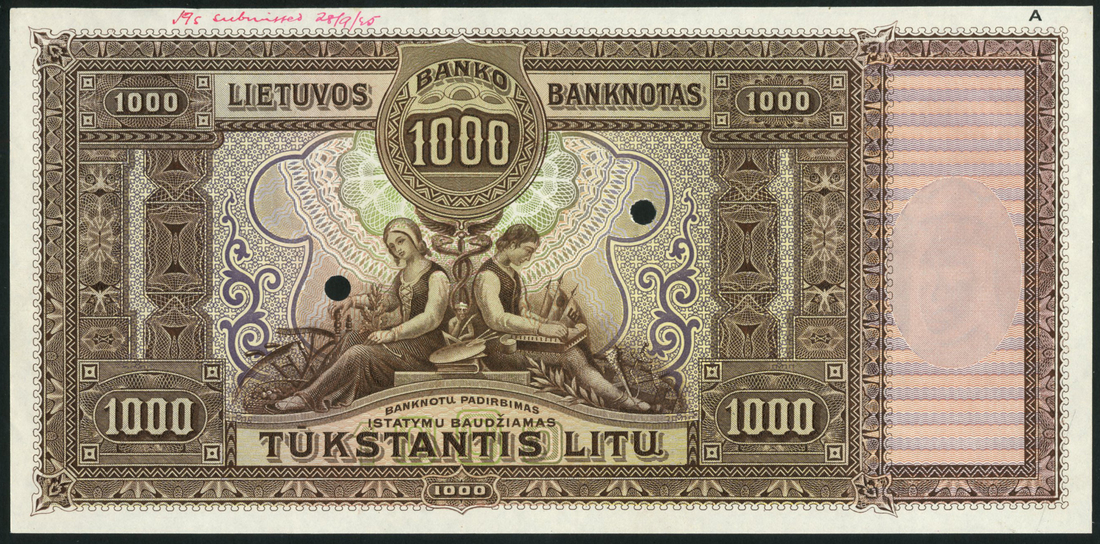 (†) Bank of Lithuania, uniface reverse proof for 1000 litu, ND (1924), no serial number, brown on multicolour underprint, allegorical man and woman at centre, value above and in each corner, two cancellation holes