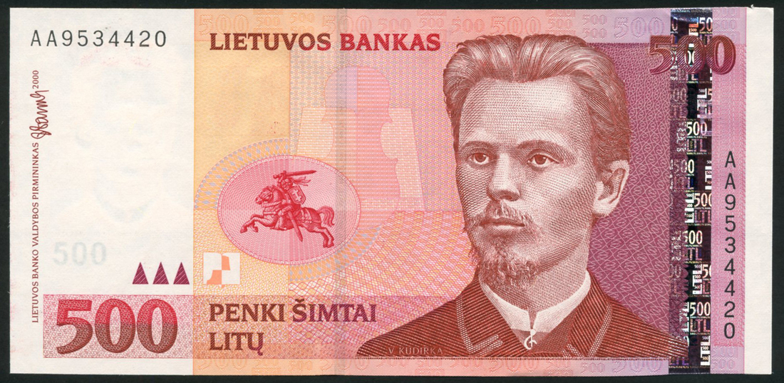 Bank of Lithuania, 500 litu, 2000, serial number AA9534420, brown and red on multicolour underprint, portrait Vincas Ludirka at right, reverse, Bell of Freedom of Lithuania, landscape view in background, also, 200 litu. 1997, serial number AD0016245, blue and multicolour, portrait Vilius Vydunas at right, reverse, lighthouse, stormy sea
