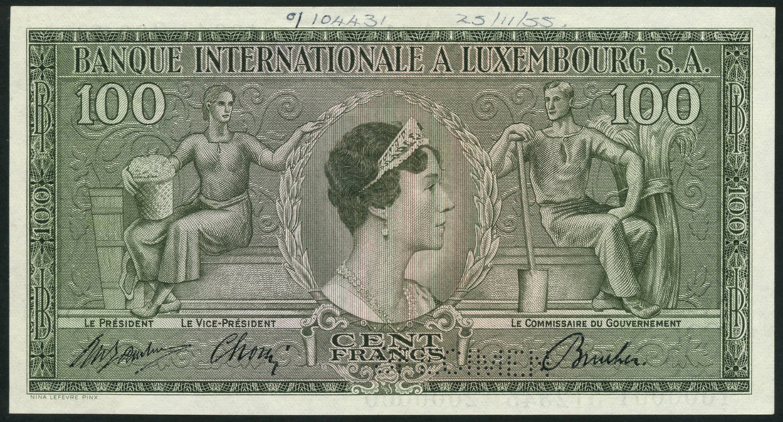(†) Banque Internationale a Luxembourg, S.A., specimen 100 francs, 21 April 1956, serial number A410000, dark olive green on multicolour underprint, Grand Duchess Charlotte at centre, farmers at left and right, reverse with three steelworkers at centre, perforated SPECIMEN