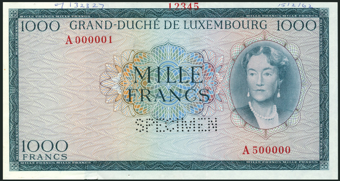 (†) Grand-Duche de Luxembourg, colour trial 1000 Francs, ND (c1962), red serial number A 000001-A 500000, dark blue-green on multicoloured underprint, Grand Duchess Charlotte at right, reverse arms at centre, value in guilloche at left, one punch hole