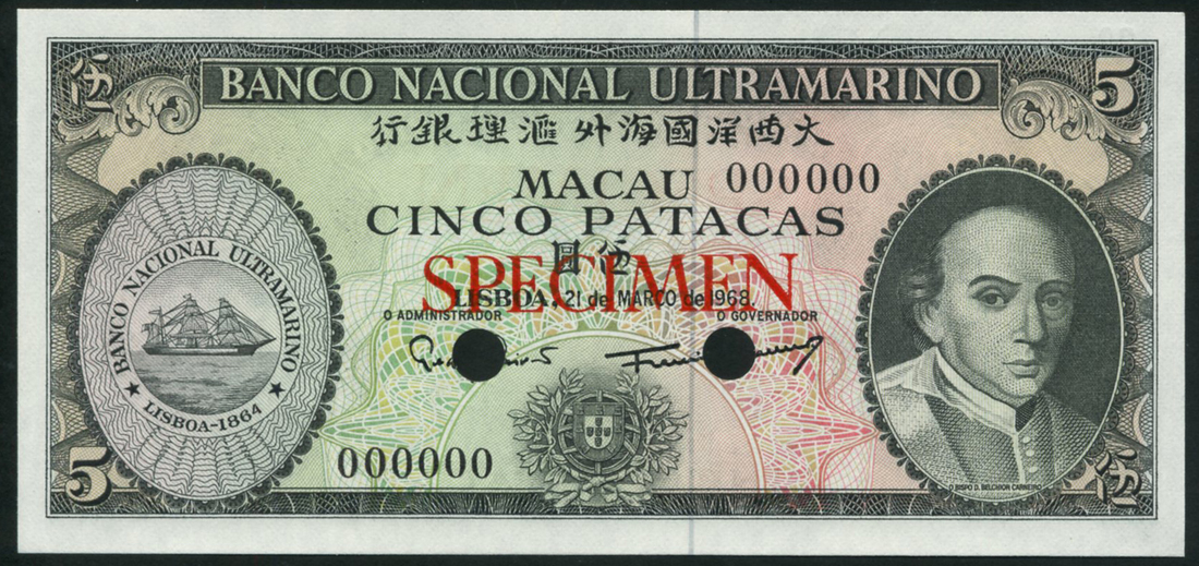 (†) Banco Nacional Ultramarino, Macau, specimen colour trial 5 Patacas (2), 21 March 1968, serial number 000000, black on green and orange underprint, Bishop D. Belchior at right, bank seal at left, reverse woman looking out at ships, value in guilloches at left and right, overprinted SPECIMEN horizontally in red on obverse and reverse, number 20 and 21 respectively in obverse top left corner, two punch holes